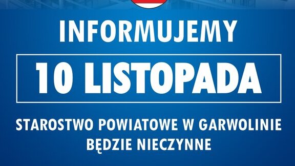 Informujemy, że w dniu 10 listopada Starostwo Powiatowe w Garwolinie będzie nieczynne.
