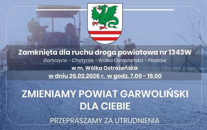 Powiatowy Zarząd Dróg w Garwolinie informuje, że od dnia 28.07.2025 r. od godziny 7.00 zostanie zamknięta dla ruchu droga powiatowa Nr 1337W Miastków Kościelny – Ryczyska – Gózdek w miejscowości Miastków Kościelny.