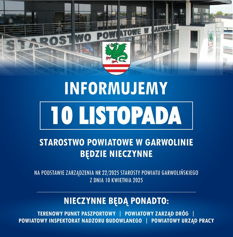 Informujemy, że w dniu 10 listopada Starostwo Powiatowe w Garwolinie będzie nieczynne.