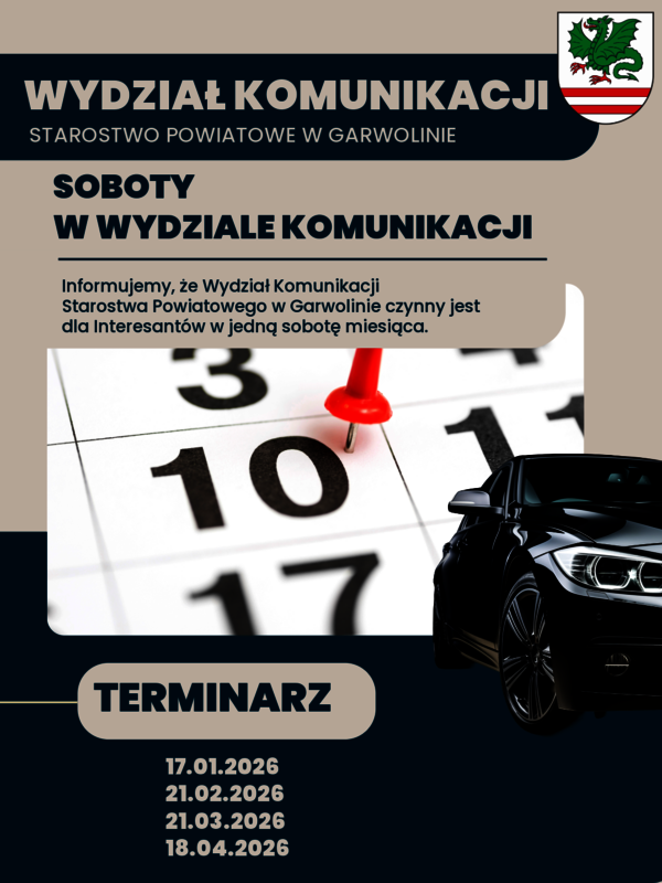 Informujemy, że Wydział Komunikacji Starostwa Powiatowego w Garwolinie czynny jest dla Interesantów w jedną sobotę miesiąca.