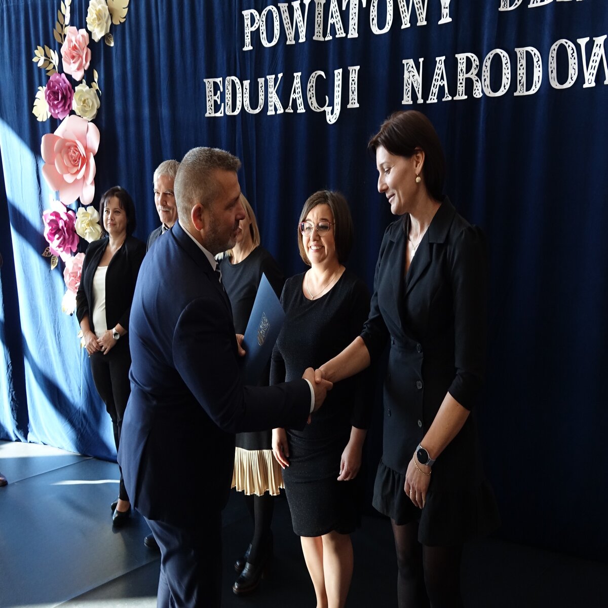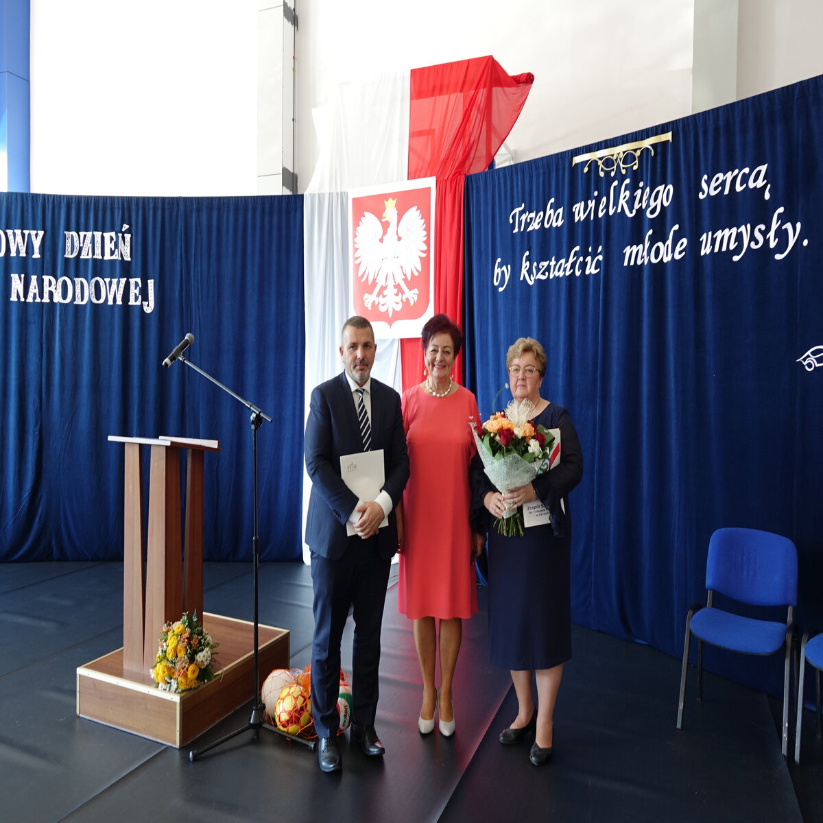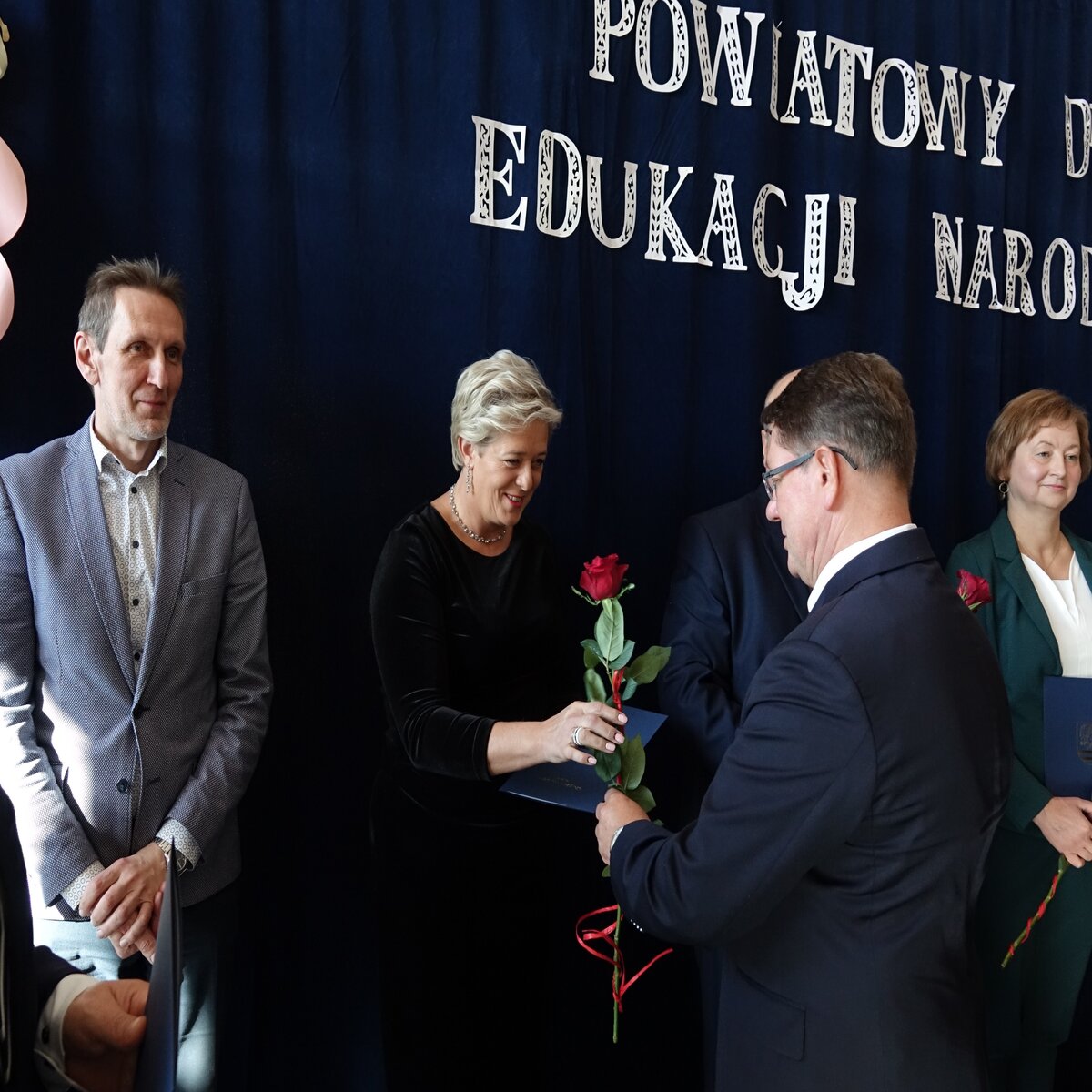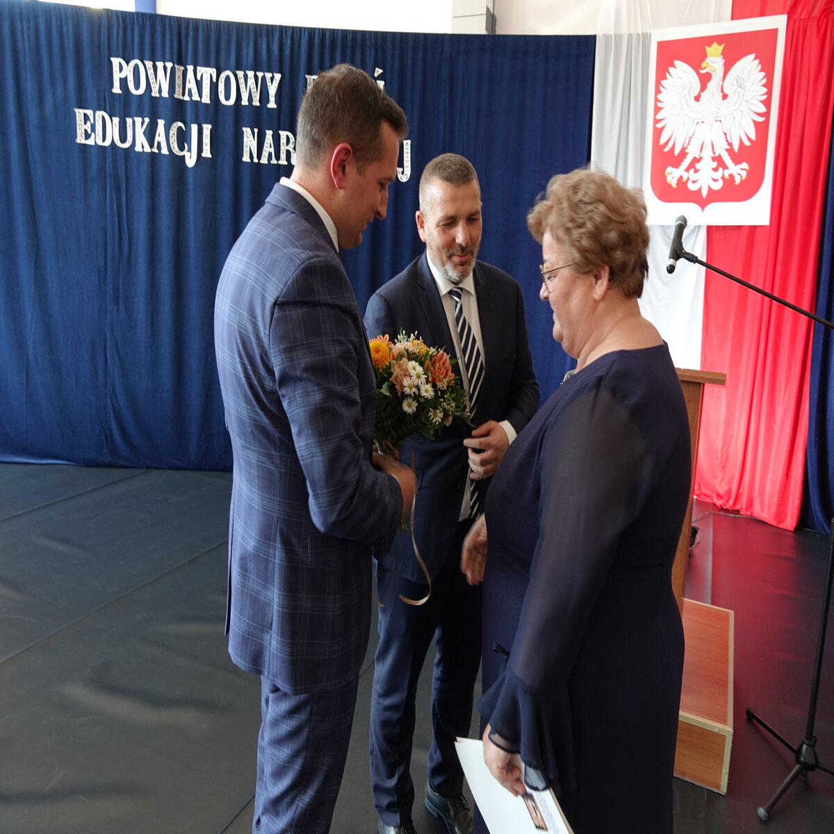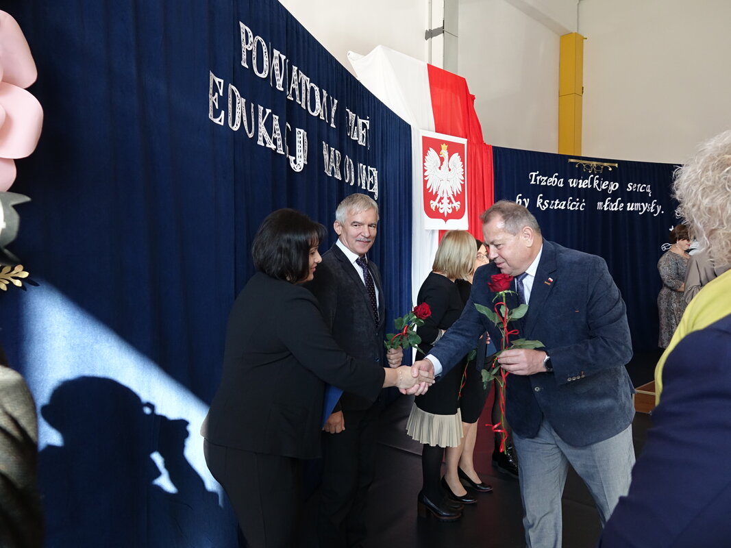 Starosta Powiatu Garwolińskiego Mirosław Walicki na ręce Dyrektor Szkoły Ewy Flagi złożył serdeczne gratulacje i podziękował za zaangażowanie w działania na rzecz rozwoju szkoły i edukacji wychowanków.