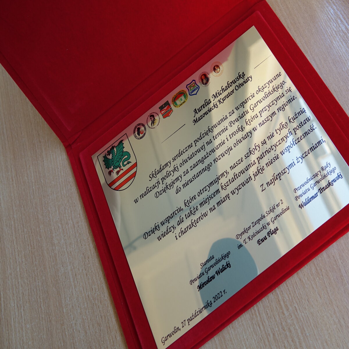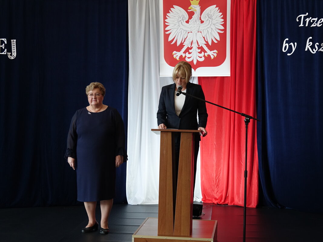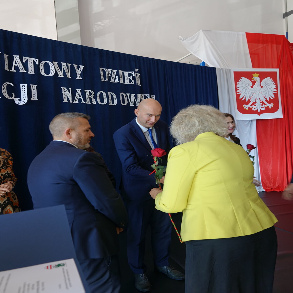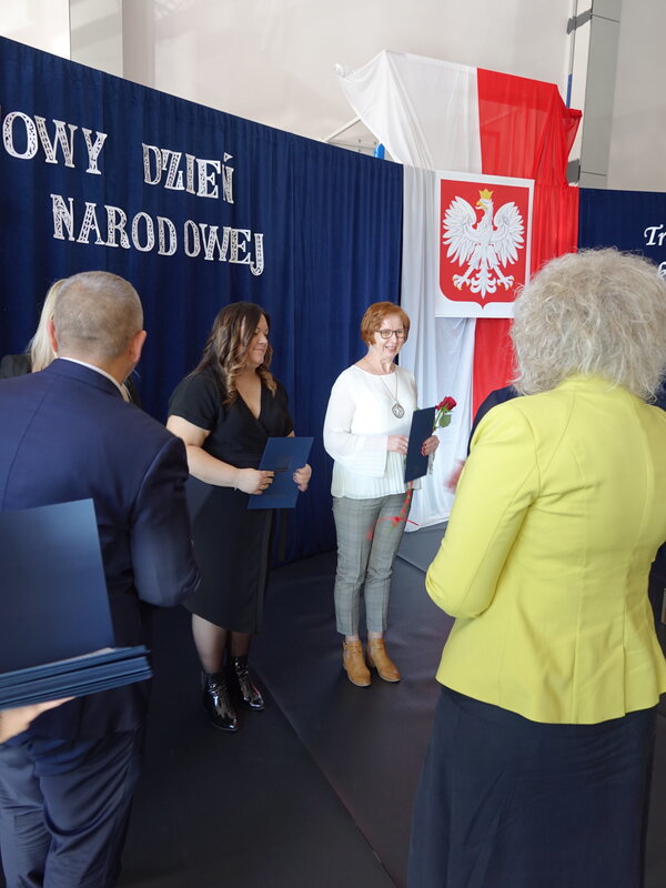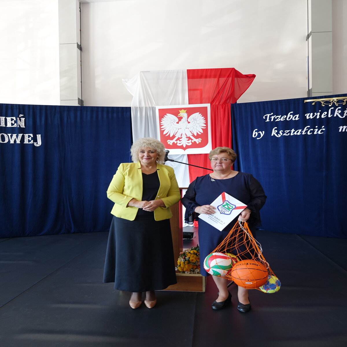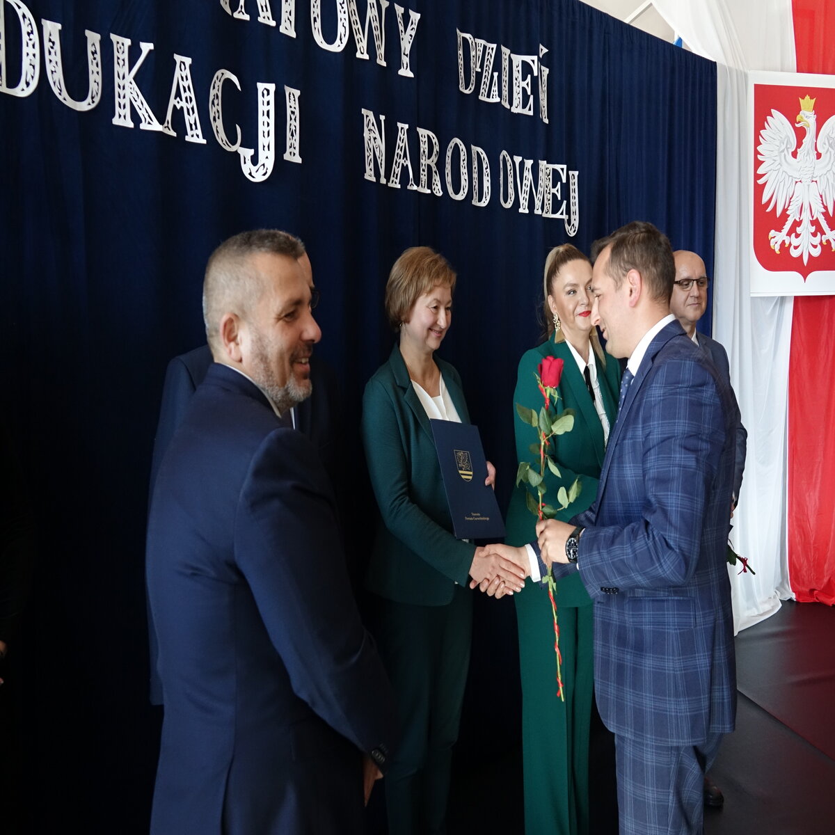 Starosta Powiatu Garwolińskiego Mirosław Walicki na ręce Dyrektor Szkoły Ewy Flagi złożył serdeczne gratulacje i podziękował za zaangażowanie w działania na rzecz rozwoju szkoły i edukacji wychowanków.