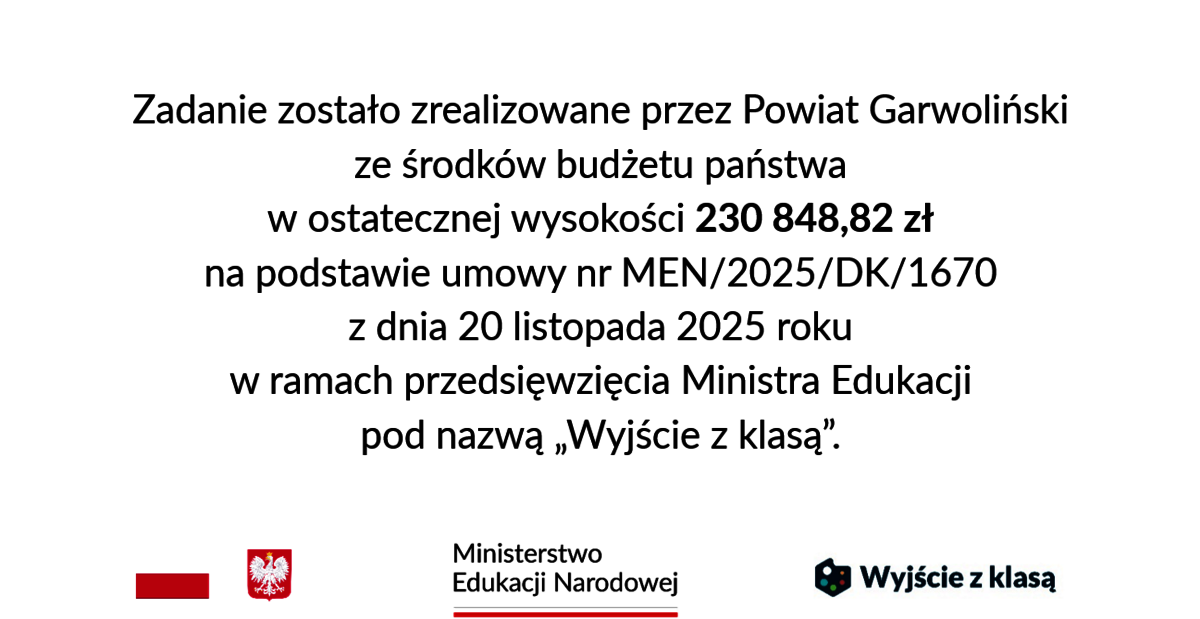 W dniu 20.11.2025 r. Powiat Garwoliński podpisał umowę z Ministerstwem Edukacji Narodowej na realizację projektu pn. „Wyjście z klasą”. Kwota dotacji wynosi 245 345,10 zł.