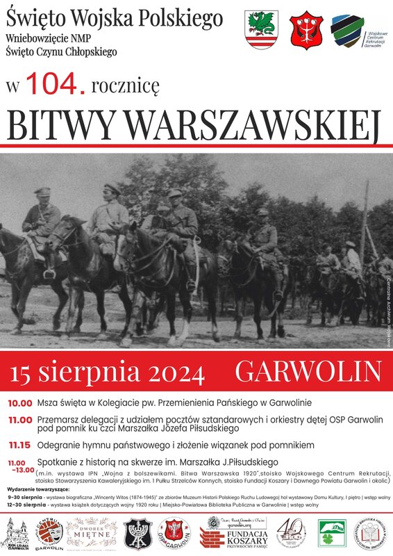 15 sierpnia jest dla nas wszystkich czasem wiary w niezłomną siłę polskości oraz patriotycznego umocnienia. 104. rocznica wielkiego zwycięstwa, tzw. „Cudu nad Wisłą” to imponujący znak pięknej historii, którą wspólnie będziemy świętować w Garwolinie.