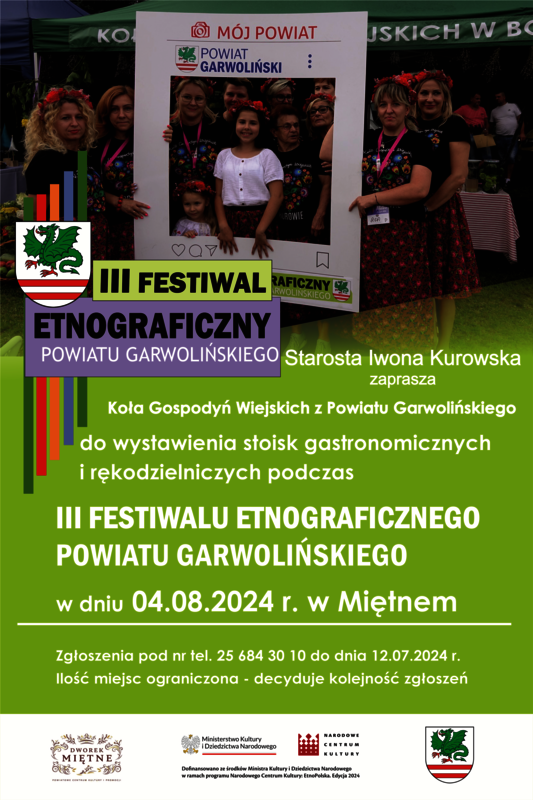 Starosta Powiatu Garwolińskiego Iwona Kurowska zaprasza Koła Gospodyń Wiejskich z Powiatu Garwolińskiego do wystawienia stoisk gastronomicznych i rękodzielniczych podczas III Festiwalu Etnograficznego Powiatu Garwolińskeigo w dniu 4 sierpnia 2024 r. w Miętnem.