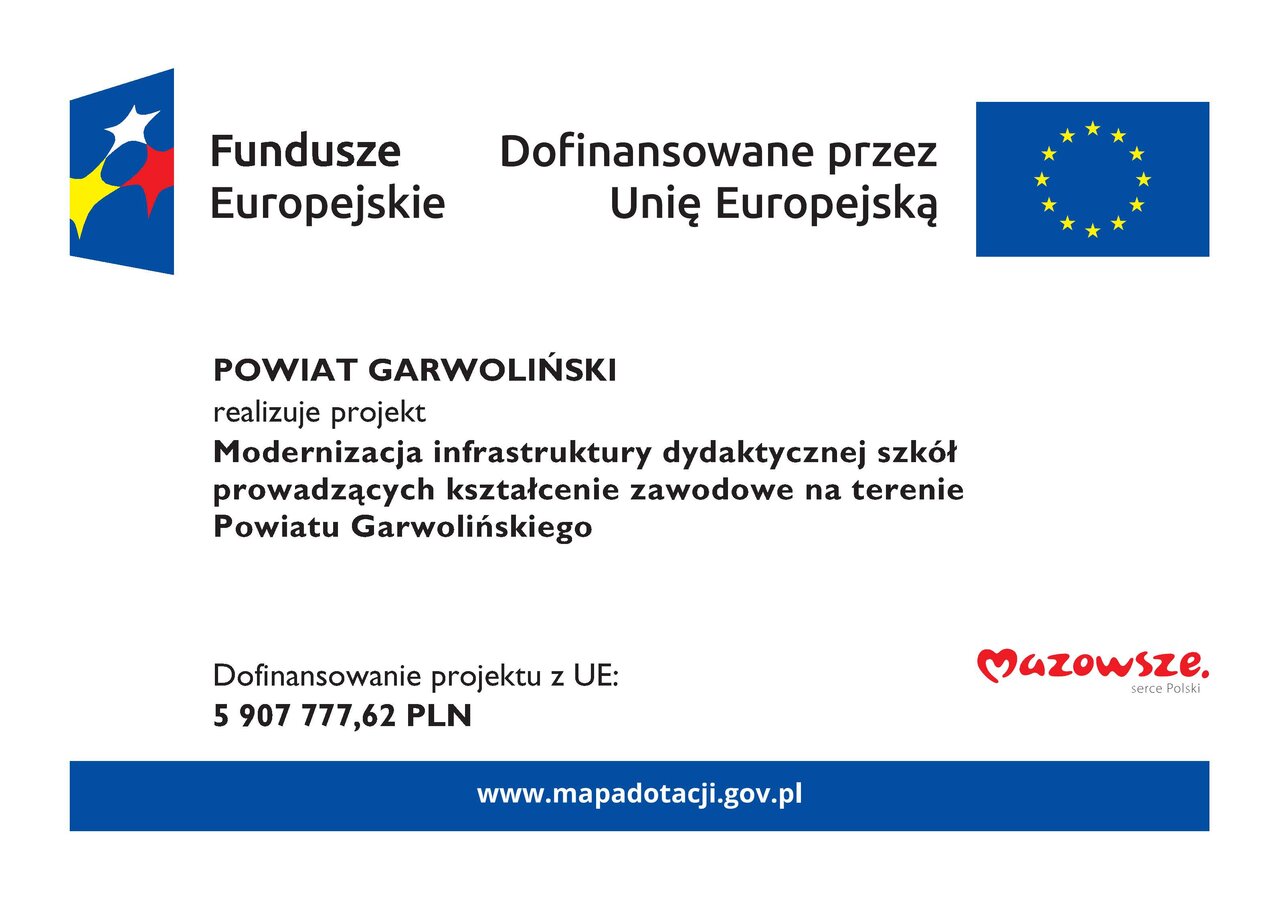 W październiku 2025 roku Powiat Garwoliński podpisał umowę na realizację projektu „Modernizacja infrastruktury dydaktycznej szkół prowadzących kształcenie zawodowe na terenie Powiatu Garwolińskiego”. Inwestycja ta jest współfinansowana ze środków Europejskiego Funduszu Rozwoju Regionalnego w ramach programu „Fundusze Europejskie dla Mazowsza 2021-2027”.