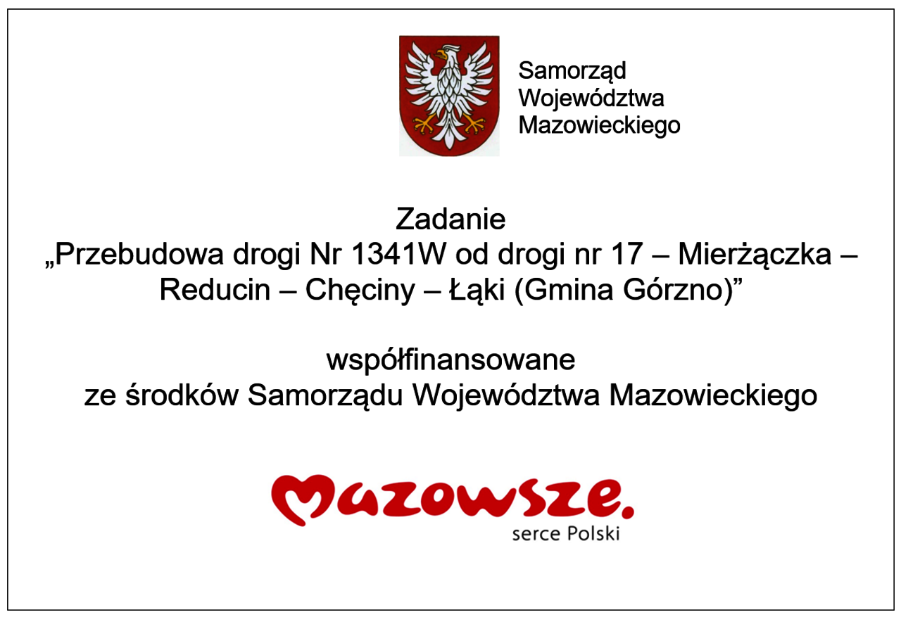Zadanie pn.: „Przebudowa drogi Nr 1341W od drogi nr 17 – Mierżączka – Reducin – Chęciny – Łąki (Gmina Górzno)” współfinansowano ze środków Województwa Mazowieckiego.