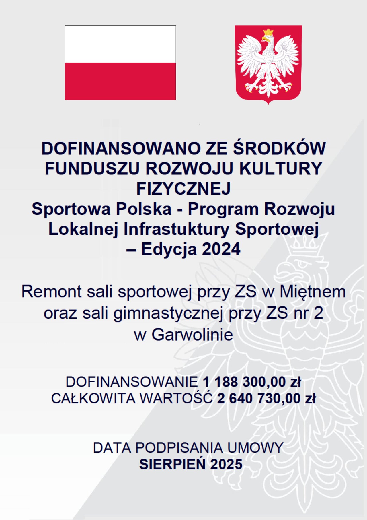 Powiat Garwoliński podpisał w sierpniu 2025 roku umowę na dofinansowanie projektu, „Remont sali sportowej przy ZS w Miętnem oraz sali gimnastycznej przy ZS nr 2 w Garwolinie,". Projekt jest finansowany w ramach programu „Sportowa Polska – Program Rozwoju Lokalnej Infrastruktury Sportowej – Edycja 2024” prowadzonego przez Ministerstwo Sportu i Turystyki. Otrzymana dotacja z Funduszu Rozwoju Kultury Fizycznej wynosi 1 188 300 zł. Całkowity koszt przedsięwzięcia to 2 640 730 zł.